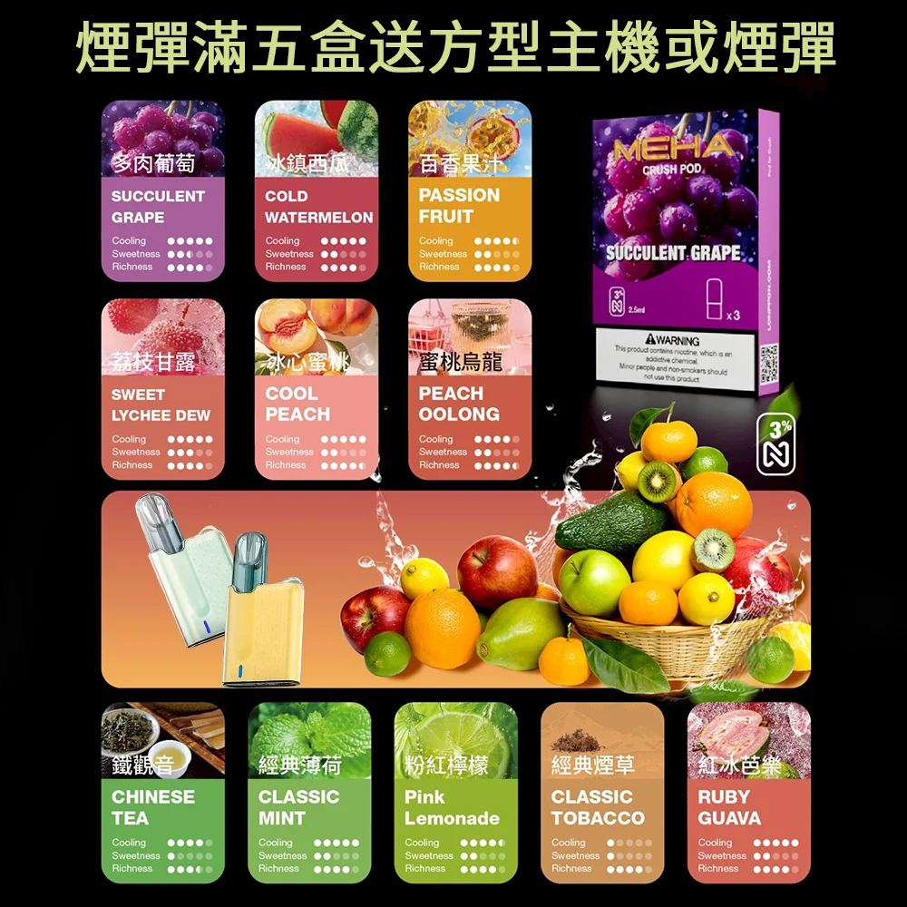 - 嚴選MEHA五代Crush等熱門霧化彈與主機組合,清楚標示容量、濃度與相容機型,選購更有保障